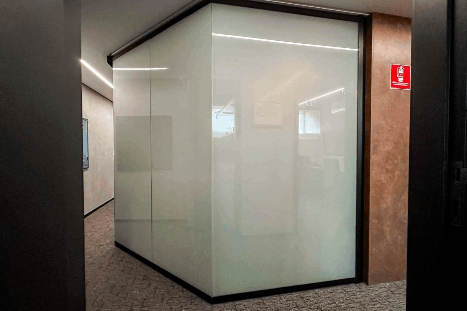 • Multifuncionalidade (Lousa Digital): Além da privacidade, a película inteligente quando no modo opaco, pode atuar como tela de projeção ou lousa, estimulando a colaboração.