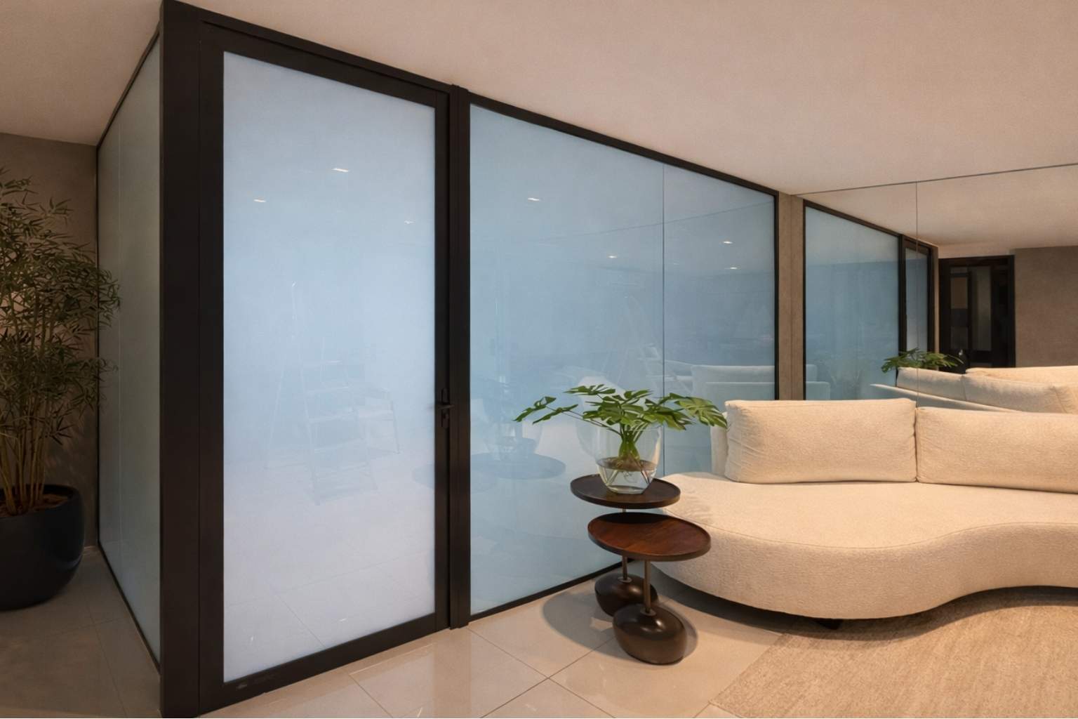 A película inteligente permite que o mesmo espaço seja aberto e integrado ou reservado e privado em segundos, sem intervenções físicas ou mudanças no layout.