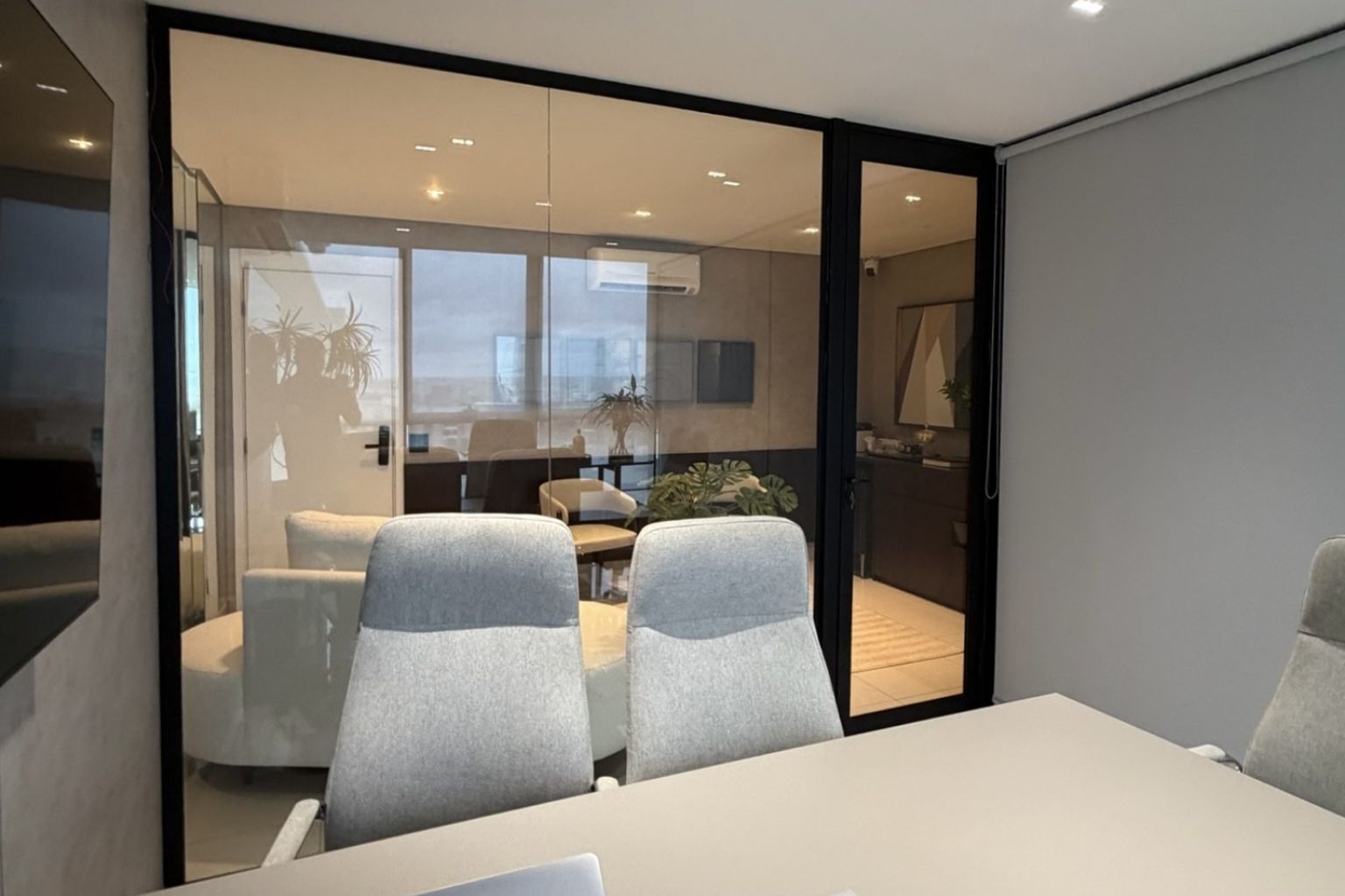 No uso diário, o vidro permanece transparente, mantendo a integração visual com o restante do escritório.